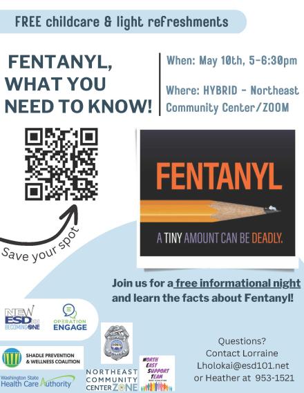 Join us for a free informational night and learn the facts about fentanyl, America's #1 drug threat. There will be free childcare and light refreshments. Please address questions to Lorraine at Lholokai@esd101.net or Heather at 509-953-1521.
