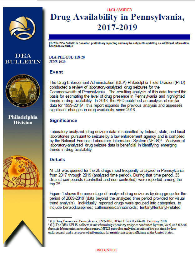 DEA's Philadelphia Division conducted a review of laboratory analyzed drug seizures for Pennsylvania. The results of analyzing this data formed the basis for estimating the level of drugs present in Pennsylvania and highlights trends in drug availability.