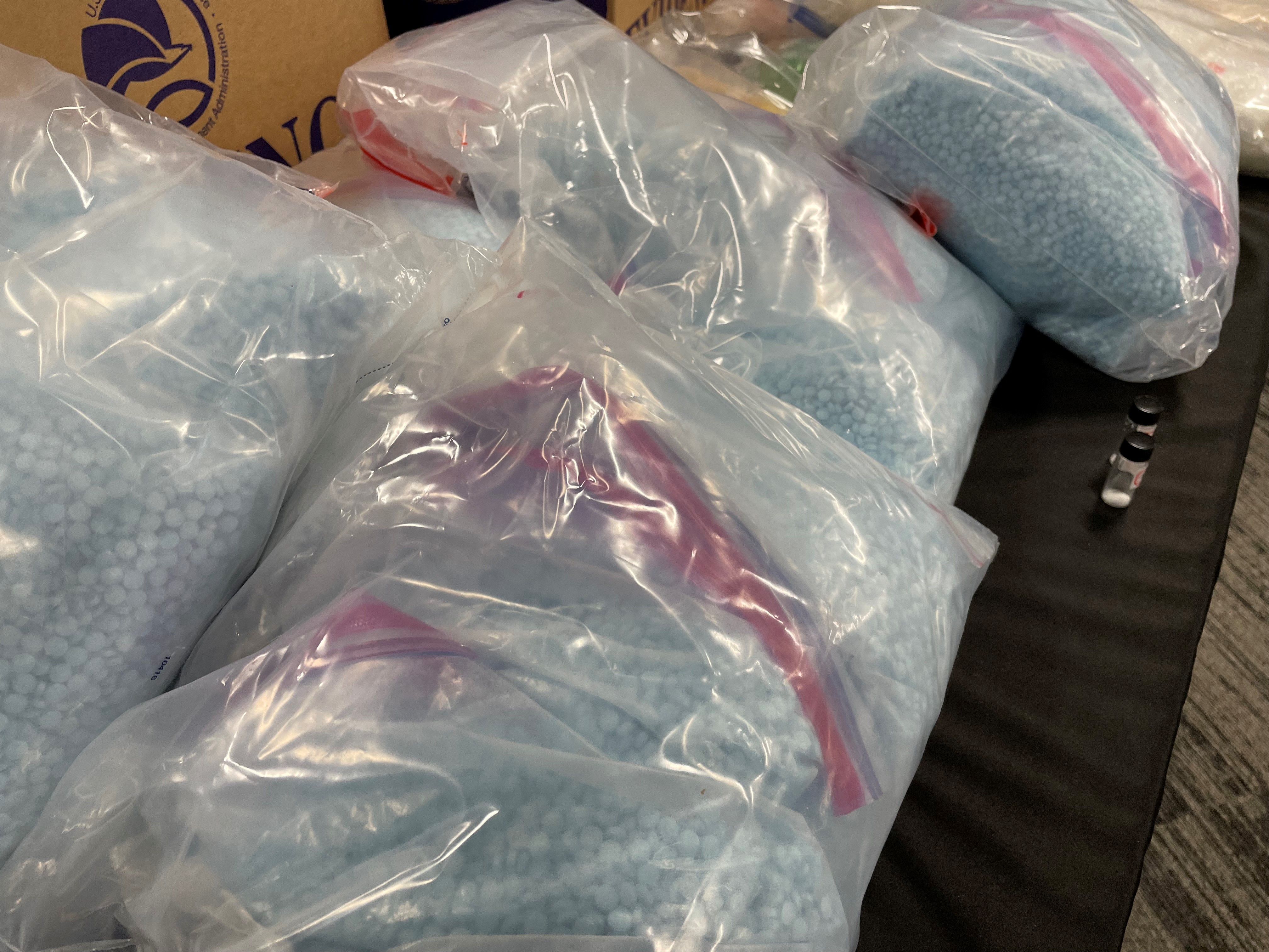 • Bags of blue fentanyl pills, displayed on a table top