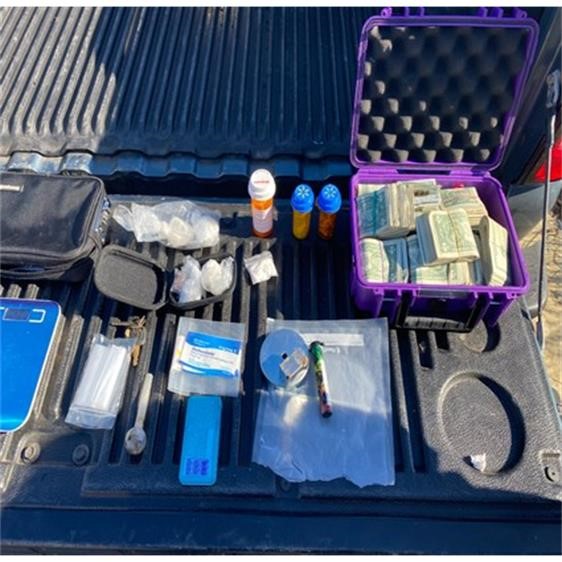 A search of Russell resulted in the seizure of two large bundles of cash folded in half and rubber banded. A search of the vehicle revealed two scales, a meth pipe, torches, baggies, methamphetamine, Suboxone, hydrocodone and Adderall pills, cocaine, and a locked box containing U.S. currency. A total of $10,779.00 in cash was seized during the traffic stop.  Russell was arrested following the traffic stop and released on a state bond.