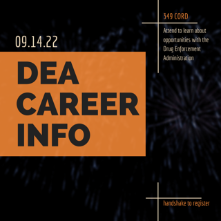 Special Agent Bryan Singleton will be conducting multiple DEA Orientations (PowerPoint Presentations to discuss: Special Agent, Diversion Investigator, Intelligence Research Specialist, Aviation, and Forensic Chemist Careers within the DEA) for interested students, faculty, and staff on Wednesday, September 14, 2022 in the UA Student Success Center, Room 349.