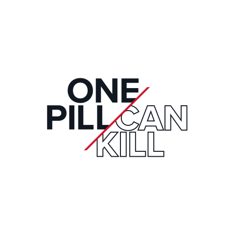 One Pill Can Kill Logo-One Pill in Black, Can Kill in White with black out lining the word and a red line separating the words