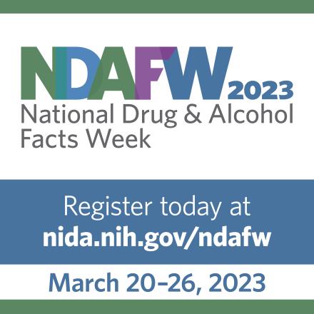 DEA’s partner, the National Institute on Drug Abuse (NIDA), is gearing up for National Drug and Alcohol Facts Week® (NDAFW) 2023 to be held March 20-26. NDAFW is an annual, week-long health observance that inspires dialogue about the science of drug use and addiction among youth. NDAFW offers educators, prevention specialists, counselors, and other youth intermediaries flexible programming to identify topics of greatest interest to their community and science-based information and resources that help improve knowledge and awareness, while also promoting skills that support informed decision-making, healthy coping, and other skills that are critical to the prevention of substance use among youth. For questions, please contact NIDA at drugfacts@nida.nih.gov for assistance and use the register link to register an event.