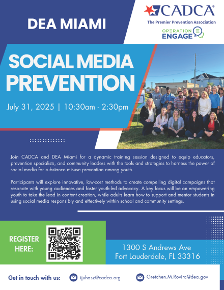Join Operation Engage Fort Lauderdale for a social media prevention training session. Educators, prevention specialists, and community leaders will be equipped with the tools and strategies to harness the power of social media for substance misuse prevention among youth. Register by visiting https://research.sogolytics.com/survey/form?k=SsXVVSsSPTYsPsPsP&lang=0 or scanning the QR code in the flyer above. Questions? Contact Community Outreach Specialist Gretchen Rovira at Gretchen.M.Rovira@dea.gov.