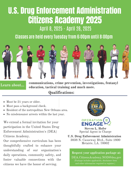 2. DEA Citizens’ Academy: This program underscores the importance of forging robust partnerships with community leaders and enhancing cooperation with local entities. Participants will receive comprehensive insights into the operations of federal drug law enforcement, fostering a better understanding of our collaborative efforts to tackle drug trafficking, abuse, and associated violence.