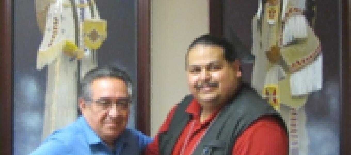Resident Agent in Charge Reinaldo Lopez congratulating Captain James Shike III the recipient of the DEA Tribal Narcotics Officer of the Year Award.