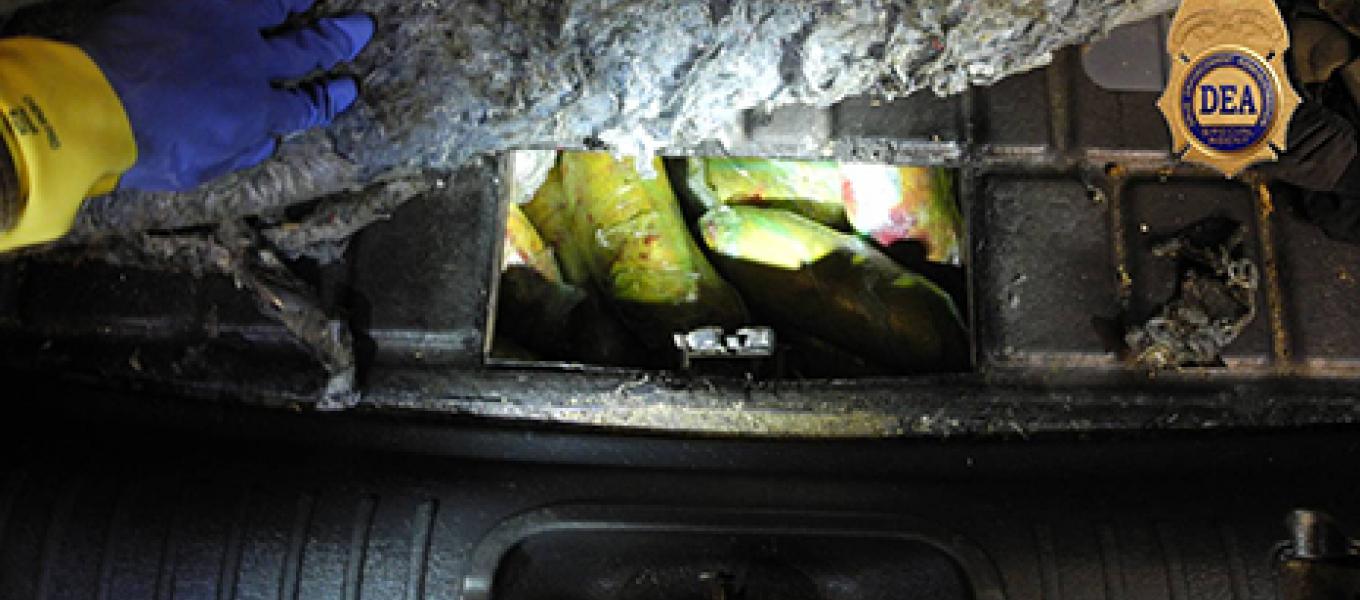 During a search of the vehicle, investigators located an access panel in the rear cargo area of the vehicle that enabled investigators to access the gas tank. Inside of the gas tank, investigators located and removed the suspected heroin. Each package of heroin was covered in mustard and red pepper, which is one method used by drug traffickers in an attempt to mask the smell of the heroin from drug detection canines.