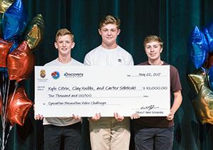 The DEA, DEA Educational Foundation, and Discovery Education awarded Kyle Citrin, Clay Knibbs, and Carter Soboleski of Daniel Hand High (Madison Public School District) the $10,000 Operation Prevention Video Challenge grand prize. The students also received the most votes during the People’s Choice award voting period, earning them a trip for an exclusive behind-the-scenes tour of DEA’s Training Academy in Quantico, Virginia for their video entitled “The Cork Board.”