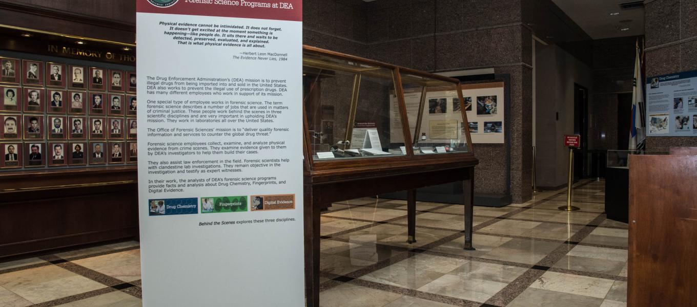 “Behind the Scenes” explores the DEA Office of Forensic Science’s role in collecting, examining, and analyzing physical evidence from crime scenes. DEA’s drug chemistry, fingerprints, and digital evidence experts deliver valuable forensic information and services to combat the global drug threat. The exhibit discusses their important work while inspiring budding scientists to consider forensic science careers at DEA.