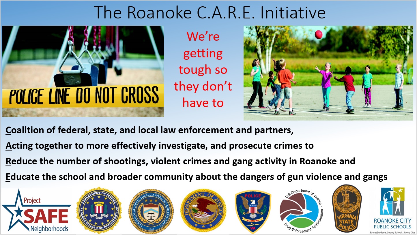 Roanoke C.A.R.E. is the coalition of federal, state, and local law enforcement agencies and partners acting together to more effectively investigate and prosecute crimes to reduce the number of shootings, violent crimes and gang activity in the City of Roanoke, and to educate both the school and broader community about the dangers of gun violence and gang life.