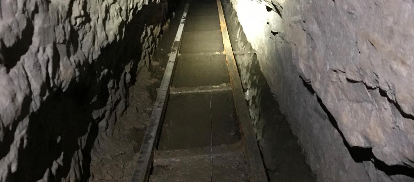 The tunnel, that is approximately five and a half feet tall and two feet wide, has an average depth of 70 feet from the surface. It includes an extensive rail/cart system, forced air ventilation, high voltage electrical cables and panels, an elevator at the tunnel entrance, and a complex drainage system.