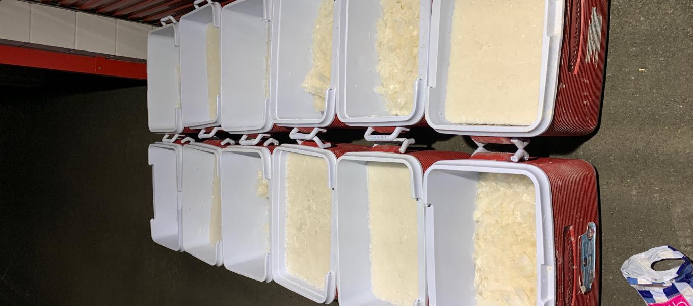 The investigators obtained search warrants for the storage units and discovered a total of 1,043 pounds of crystal methamphetamine in one storage unit. The second storage unit contained a full methamphetamine conversion lab with 170 gallons of liquid methamphetamine stored in 34 buckets (five gallons each), which was partially crystalized. Additionally, there was ten pounds of packaged methamphetamine stored in the same storage unit with the liquid. The typical conversion rate of seven pounds of crystal methamphetamine per one gallon of liquid methamphetamine, (170 gallons x 7), produces an additional 1,190 pounds of methamphetamine. In total, 1,200 pounds of methamphetamine was seized from the second storage unit. The next day on Friday, February 21, 2020, the third storage unit was searched and yielded 350 pounds of crystal methamphetamine, two kilograms of cocaine, six assault rifles, one pistol, and 2,800 rounds of ammunition.