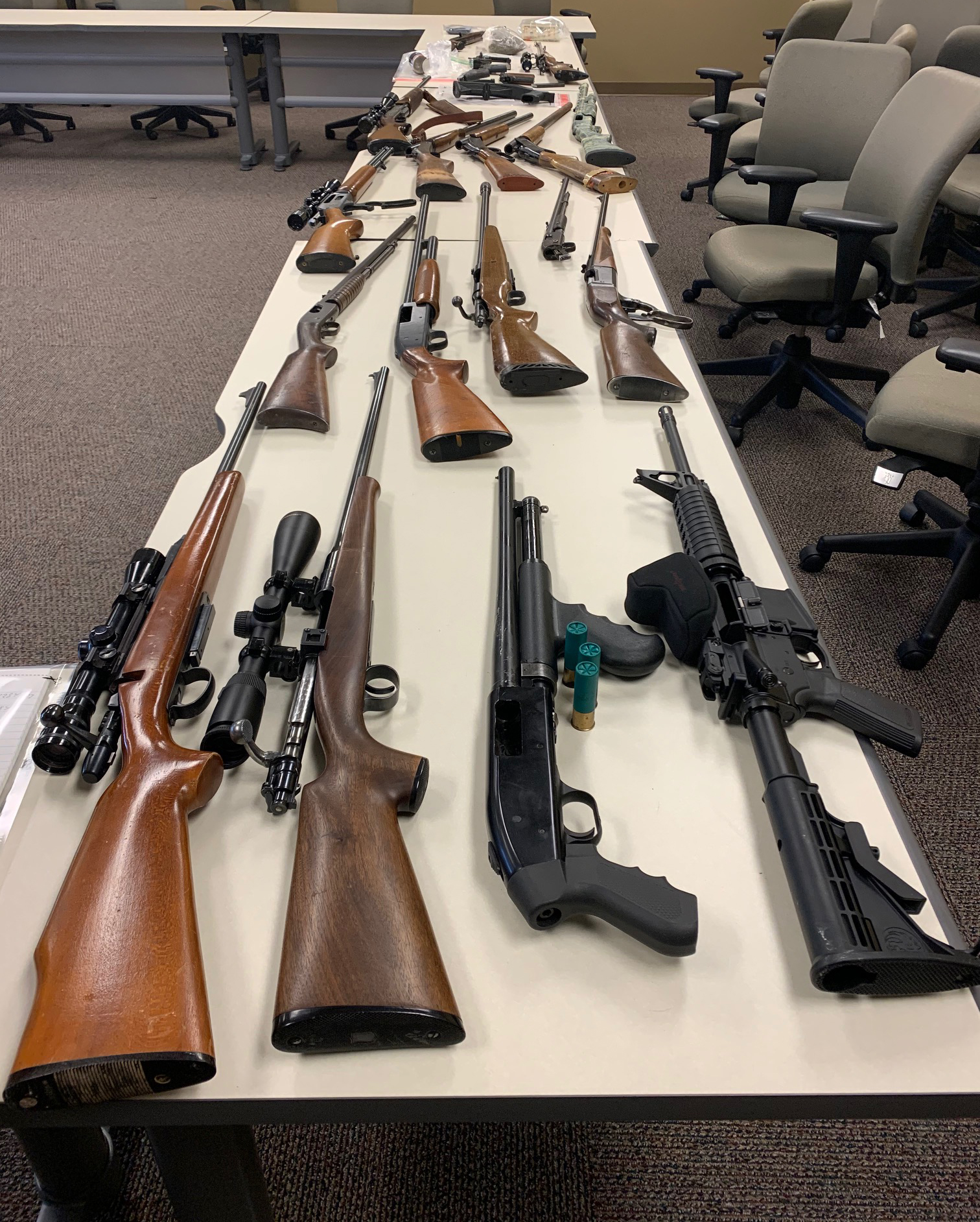 Officers located a large firearms safe in the basement of Gregg’s residence that contained 22 firearms and a large amount of cash. Officers also searched Gregg’s vehicle and found 151.6 grams of methamphetamine, 436.5 grams of marijuana, and 207 prescription pills in unlabeled pill bottles. Officers also found methamphetamine inside a fanny pack. They found a loaded Smith and Wesson .40-caliber semi-automatic pistol on top of the fanny pack. Gregg told officers he had the firearm because he had been threatened by individuals wanting to do him harm, the affidavit says, and Gregg stated he had the firearm in case those individuals came to his residence to harm him.