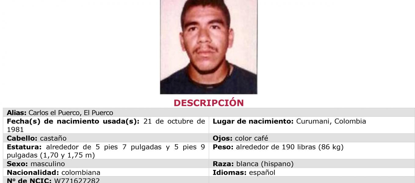 Suspected ELN leader Villegas-Palomino aka Carlos El Puerco, 38, is also charged and considered a fugitive as are Jaime Miguel Picon-Rodriguez aka Chencho and Jairo, 38 and Diomedes Barbosa-Montaño aka El Burro, 38.
