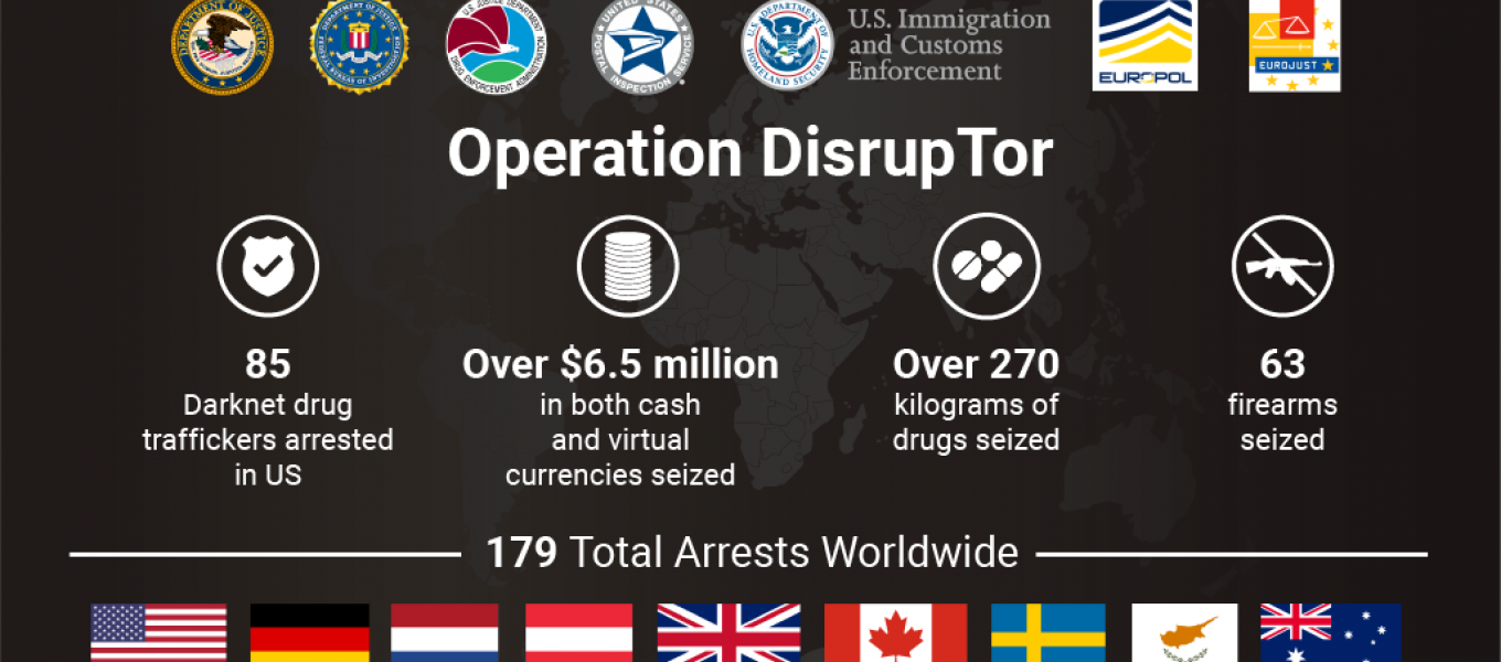 This operation resulted in the seizure of over $6.5 million in both cash and virtual currencies; approximately 500 kilograms of drugs worldwide; 274 kilograms of drugs, including fentanyl, oxycodone, hydrocodone, methamphetamine, heroin, cocaine, ecstasy, MDMA, and medicine containing addictive substances in the United States; and 63 firearms. Darknet vendor accounts were identified and attributed to real individuals selling illicit goods on Darknet market sites such as AlphaBay, Dream, WallStreet, Nightmare, Empire, White House, DeepSea, Dark Market and others. By leveraging complementary partnerships and surging resources across the U.S. government and Europol, Operation DisrupTor was used to significantly disrupt the online opioid trade and send a strong message that criminals operating on the Darknet are not beyond the reach of law enforcement.