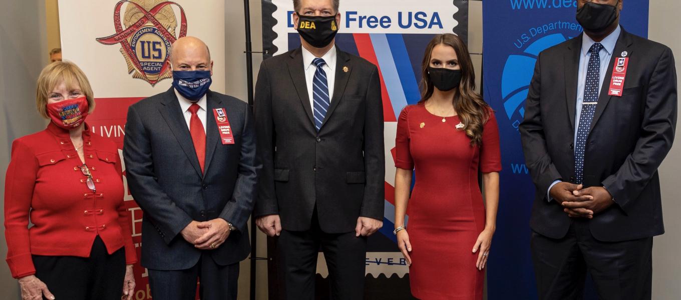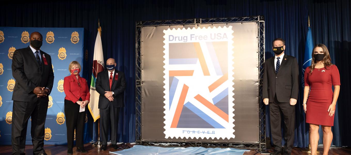 WASHINGTON – The Drug Enforcement Administration’s Acting Administrator Timothy Shea welcomed U.S. Postal Service Postmaster General and Chief Executive Officer Louis DeJoy, Miss America 2020 Camille Schrier, and National Family Partnership President Peggy Sapp for the unveiling of the Drug Free USA Forever stamp at DEA headquarters today. The stamp promotes drug abuse prevention and helps raise awareness about the dangers of drug abuse.