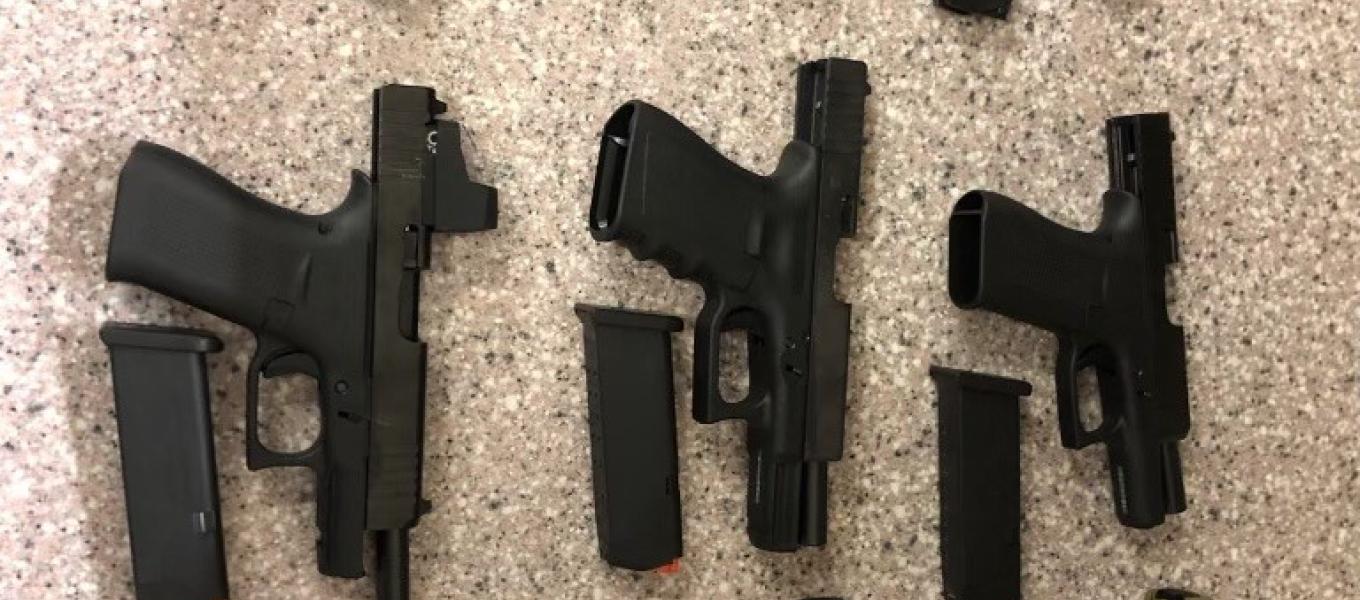 Photograph of handguns and assault weapons seized from one gun trafficker.