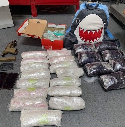 Photo of over 28 pounds of methamphetamine located inside pictured child's Shark Pillow Pet and over 9,000 fake pills containing fentanyl.