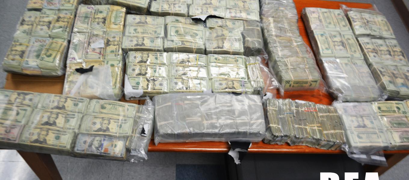 A Drug Enforcement Administration investigation that started in 2018 eventually resulted in the seizure of more than $1.5 million in drug proceeds, as well as 25 kilograms of cocaine, three kilograms of fentanyl, 10 kilograms of heroin, luxury vehicles, watches and guns. This photo shows $1.3 million seized in 2018 during a traffic stop in Phelps County, Missouri.