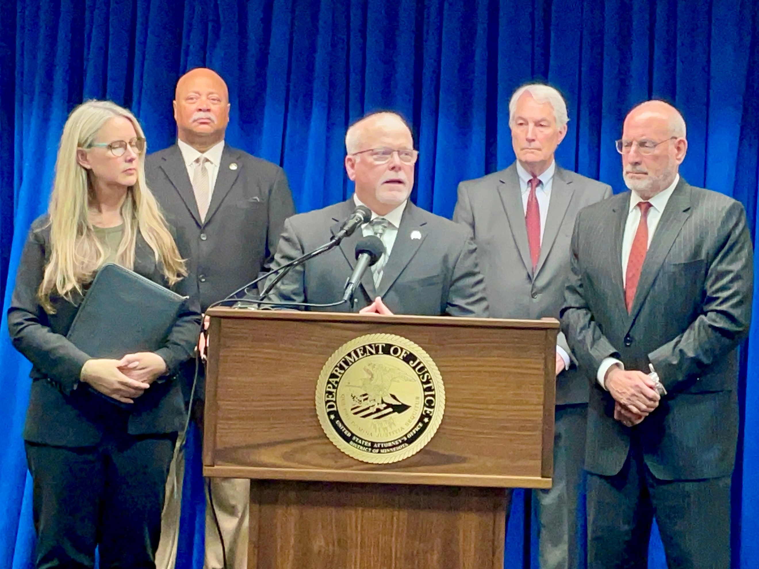 Members of the FBI, U.S. Marshals, DEA and U.S. Attorney's Office for the District of Minnesota address media at a press conference August 6, in Minneapolis.
