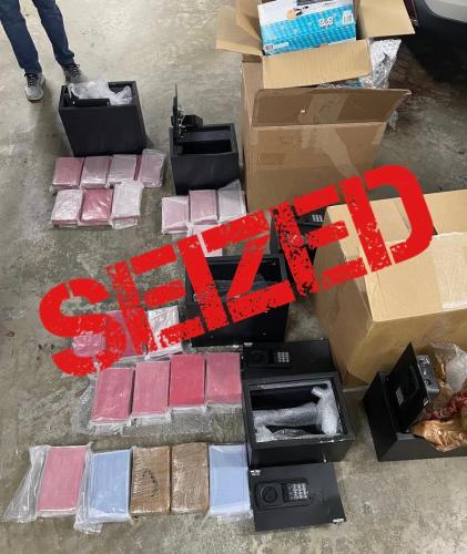 During a court-authorized search of the vehicle, agents recovered multiple locked safes from inside two cardboard boxes found in the trunk. The safes allegedly contained 23 kilogram-sized packages of cocaine wrapped in colored tape. A small quantity of fentanyl was also found in a hidden trap compartment in the Toyota Highlander.