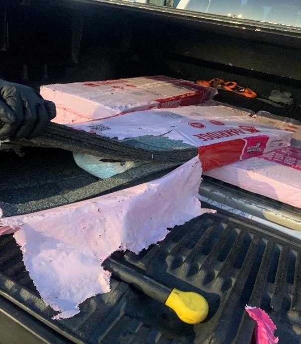 After Montes left the parking lot, EVDETF investigators conducted traffic stops on both the Jeep Cherokee and Ford F250. A Mesa Police Department Canine Detective conducted an open-air sniff of the Ford F250 and alerted to narcotics in the vicinity of the truck bed. Investigators searched Sesma’s truck and seized approximately 52 kilograms (114 pounds) of blue M30 pills laced with fentanyl, which were concealed in the roofing shingles. Sesma and Montes were subsequently placed under arrest.