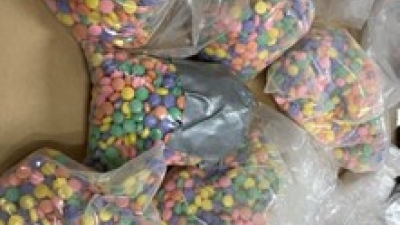 Seized fentanyl pills in various colors.