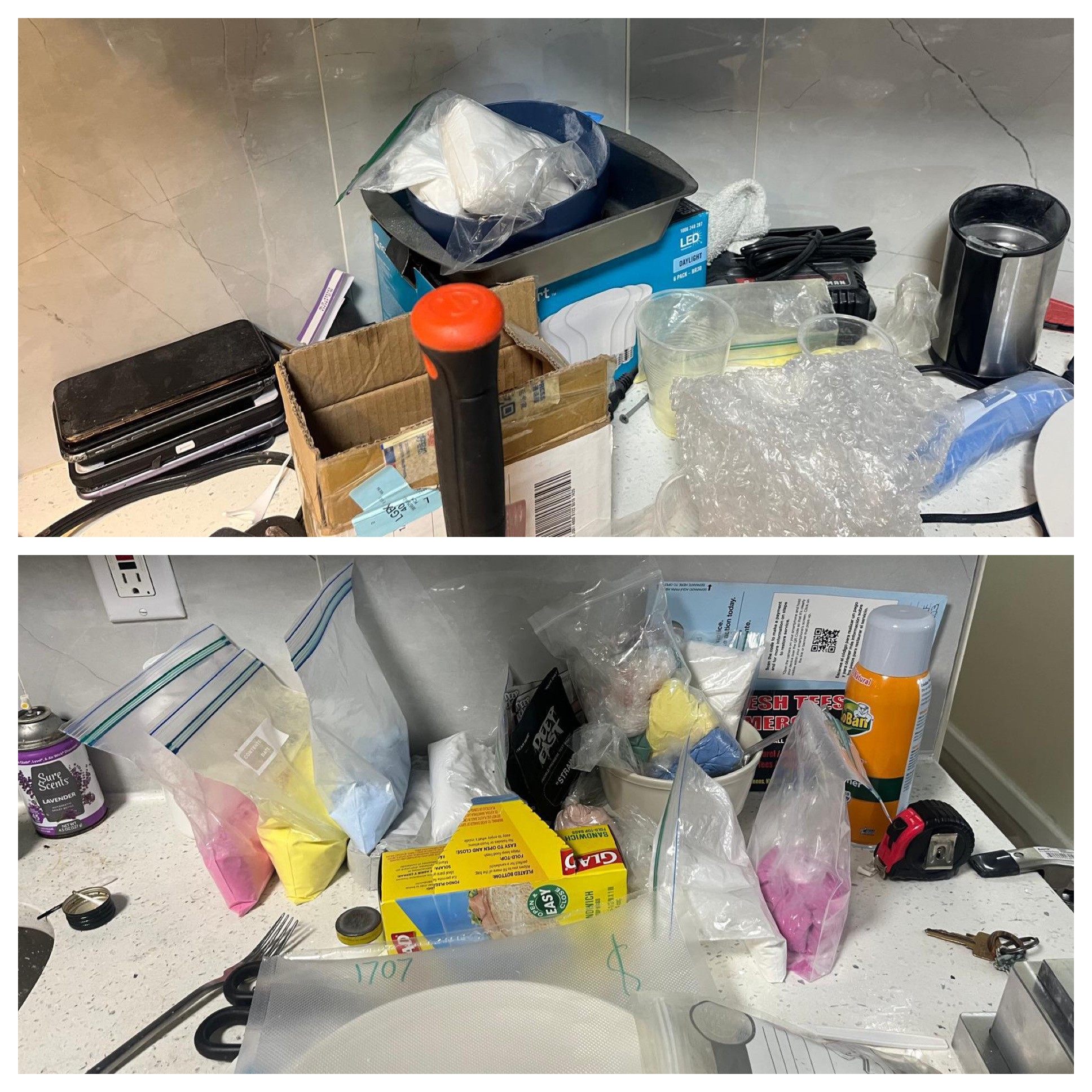 The kitchen and the living room areas contained a variety of pills in different shapes and colors, including those resembling oxycodone. The kitchen also allegedly contained large quantities of powdered narcotics believed to be fentanyl and cocaine, and a large amount of crystal methamphetamine, according to field tests performed on the substances at the location. Pill presses 3 and narcotics were found in plain view in the apartment’s common areas, and various forms of official identification were recovered from the residence.