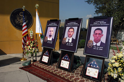 Remarks by DEA Assistant Regional Director Jay Fitzpatrick: “Today, we remember three DEA Special Agents and seven U.S. Military Service members who tragically lost their lives during operations in western Afghanistan. “During the early morning hours of Monday, October 26, 2009, Special Agents Michael E. Weston, Forrest N. Leamon, Chad L. Michael, other DEA Special Agents, U.S. Special Forces, and our Afghan counterparts, were executing Afghan search warrants at a bazaar in Afghanistan’s rugged Badghis Province. This bazaar was a safe haven for insurgents and contained significant quantities of narcotics, improvised explosive devices, and weapons used against Coalition Forces. “At approximately 0330 hours, and after an extremely successful counter narcotics/counter insurgency operation, which included an hour-long firefight with insurgents, U.S. military personnel, DEA agents, and our Afghan counterparts were departing the target area on a U.S. military CH-47 helicopter when it crashed killing Special Agent Weston, Special Agent Leamon, Special Agent Michael and seven Special Forces personnel. Twenty-six personnel were injured, including DEA FAST Team Leader Pat McDarby, who was badly hurt on impact. Risking further injury, he and other able U.S. military personnel immediately began removing the injured from the burning wreckage. “Each and every one of them performed heroically in the face of extreme danger, as they removed casualties from the crash site in order to start administering life saving measures. Also, after the crash, the other CH-47 participating in the operation returned to the crash site. U.S. military personnel and DEA Special Agents aboard that helicopter performed flawlessly in what was a dangerous and volatile situation. Thank you.” Remarks by Deputy Ambassador Francis J. Ricciardone “Thank you all for coming. As you know, early on Monday morning, our Mission and our country suffered a terrible tragedy. Three Drug Enforcement Administration Special Agents from our Mission family, along with seven U.S. Army soldiers, were killed when their CH-47 helicopter crashed in western Afghanistan. We have gathered today to pay tribute to these devoted Americans, who have made the ultimate sacrifice for their country and for the essential work we are doing in Afghanistan. “Twenty-six others aboard the helicopter were injured in the crash, and we also honor them and pray for their speedy recovery. “It is with profound sadness and admiration that I now read you the names of our fallen countrymen: