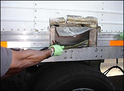 The drug shipment, hauled by a 2005 Kenworth tractor trailer with California license plates, was concealed in steel band at the perimeter of the cargo floor at the base of the trailer, and covered with a metal sheath. The cocaine was packaged in kilograms and heavily wrapped in duck tape. Investigators believe that was done to avoid detection by drug sniffing dogs.