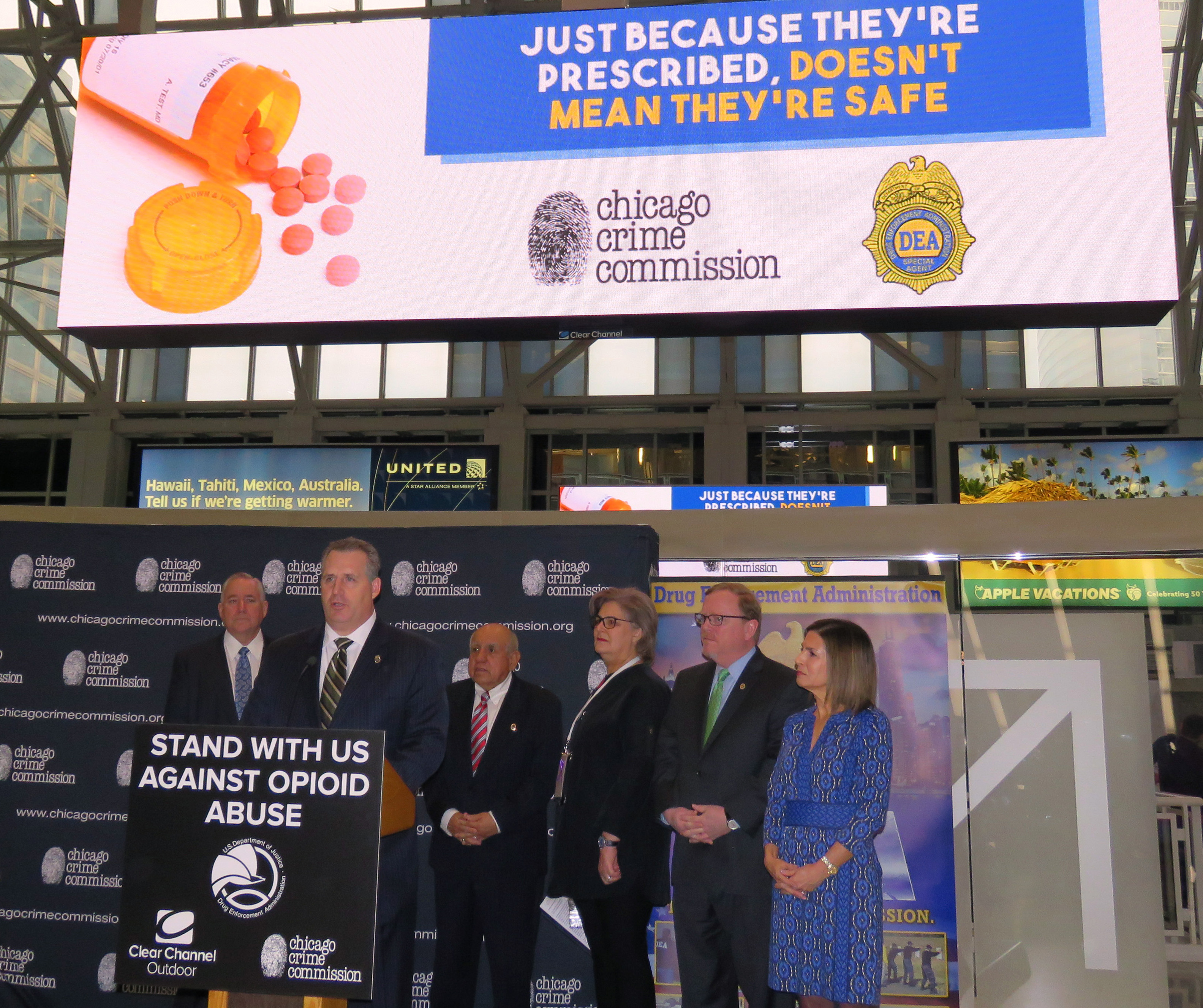 CHICAGO – A partnership was announced this month among the U.S. Drug Enforcement Administration (DEA), the Chicago Crime Commission, and Clear Channel Outdoor to highlight a public awareness campaign that addresses the prescription opioid, heroin and fentanyl epidemic plaguing the city of Chicago, our state, and our nation. Provocative and informational drug prevention and treatment messaging has already begun to appear on numerous Clear Channel Outdoor digital billboards in Chicagoland. This 12-month digital campaign will run up to 15 digital billboards and on 20 Metra in-station digital displays to promote the prevalence and dangers of opioid abuse.