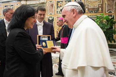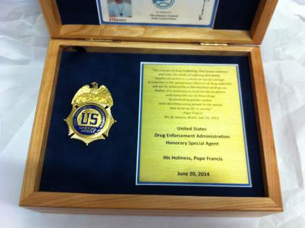 In a private meeting with then-DEA Administrator Michele Leonhart, Pope Francis was presented with honorary DEA credentials and a badge in recognition of his moral leadership and commitment to protecting life.